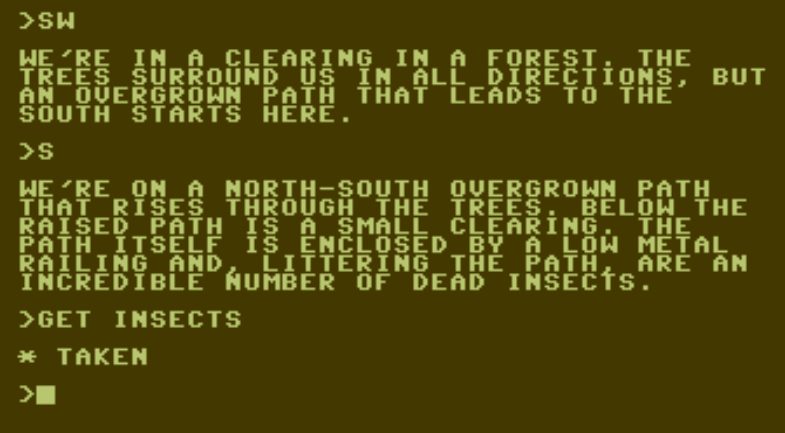 I maybe should have internalized this as a general pattern. There was another hint when climbing a ramp (the same one that has the insects) that there seems to be something below, but if you try to CLIMB DOWN you go splat and die. I tried tying the string into some sort of rope (it was described as strong, so maybe?) but otherwise had no luck so figured this was a puzzle for when I got an object later. But no: this was pretty much required as the next step in the game. But you don’t climb down where the hint is given, but rather one position off from it.