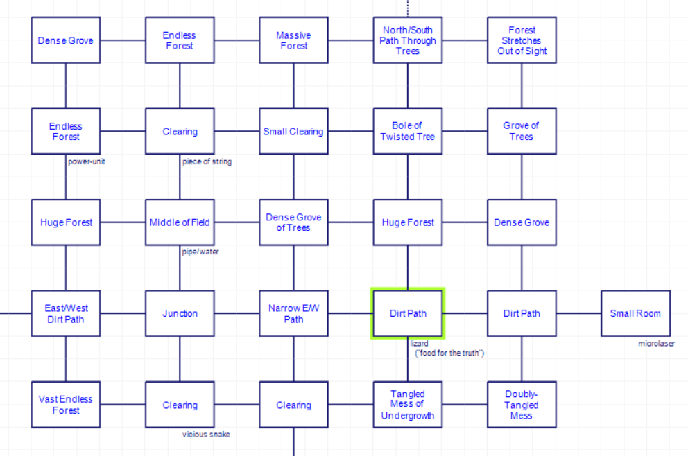 The start room is a “trap” of sorts that gathers two of the one-way exits from the maze room right before the axe, trying to deny hitting the solution randomly. This is quite typical; what’s unusual is making the exit room also a “trap” (on the bottom, three of the exits leave the maze) so it is easier to accidentally bypass the axe and leave. The priority for many of these mazes was to avoid solves just by meandering in random directions. Even Don Woods with Adventure made a test diagram to make sure “simple repetitive actions” would not allow getting through his maze too early.