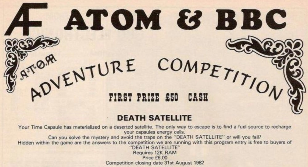 It won’t be terribly long until we get to the most famous of the computer-based contests, Pimania, which involved a real-life “Golden Sundial” and is arguably not even really an adventure game, but for now let’s consider one that definitely is, A & F Software’s Death Satellite.