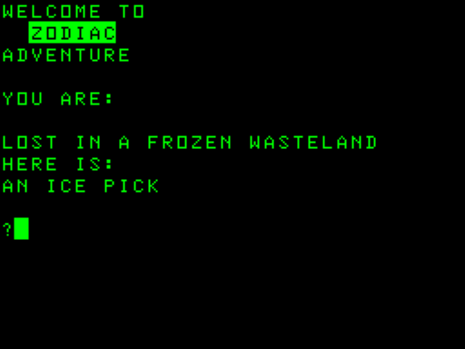 Your goal is to “solve the problem of the Astrological Adventure” which is terribly vague, but I have a guess it just means you have to make it to whatever room is designated as The End. (CASA Adventure Archive claims something about six treasures, but I think that’s about an entirely different game also called Zodiac.)