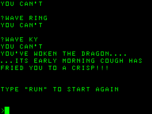 I will say I can RUB the magic ring I found in the ice (the game tells me NOTHING HAPPENS in all circumstances) and any verb/object combo I’ve thrown at the dragon has been met with I CAN’T. I also haven’t been able to get anywhere with DIG in any room. Surely there’s a break somewhere?