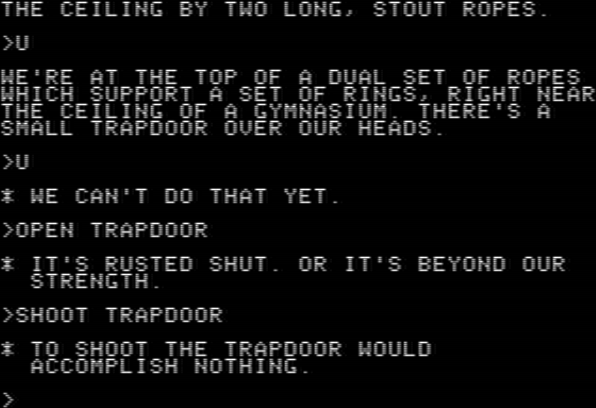 I was still left with some places I couldn’t get into. The mysterious black cube I had been carrying along I had tried to OPEN at one point and I should have known (since it didn’t give a generic failure message) I should think about it more carefully; the game said it didn’t have any obvious way of opening it. The trick is to CUT CUBE (with the laser) and then an id card falls out. The somewhat canny thing here is that I’m fairly sure we had been using it all along to get into the gymnasium, but since we’re just scanned, it didn’t matter we didn’t know it was in the cube! What the ID card does now allow is operating the various “narrow slots” I had been having to skip.