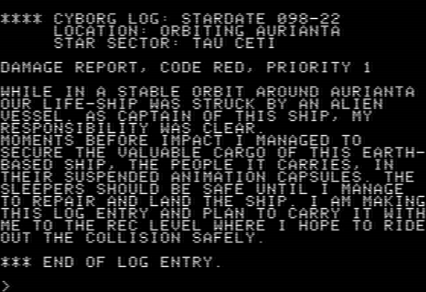 So our semi-amnesiac protagonist has been — using their cyborg skills — captaining a space vessel. They were orbiting a planet when their vessel ran into an alien ship (the one with the lizards). Our objective (??) is to fix and land the ship.