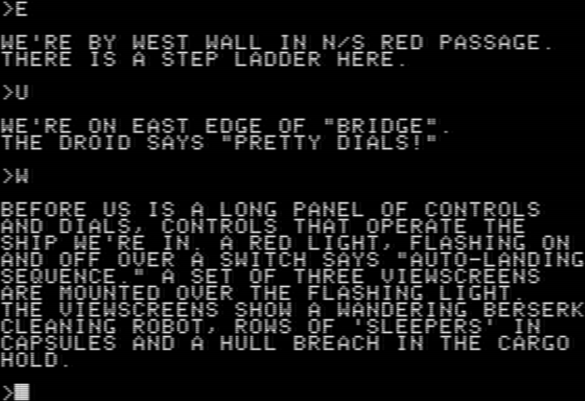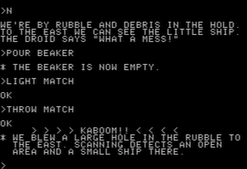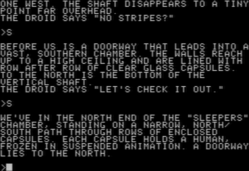 This led me to a mini-droid and some lenses. The lenses allowed seeing in the dark (no more concern about matches for a light source, although they get used for fire later) and the mini-droid becomes our protaganist’s buddy, nestling itself on a “shoulder harness” and making comments as you go through rooms. I’m reminded quite a bit of Floyd from Planetfall.