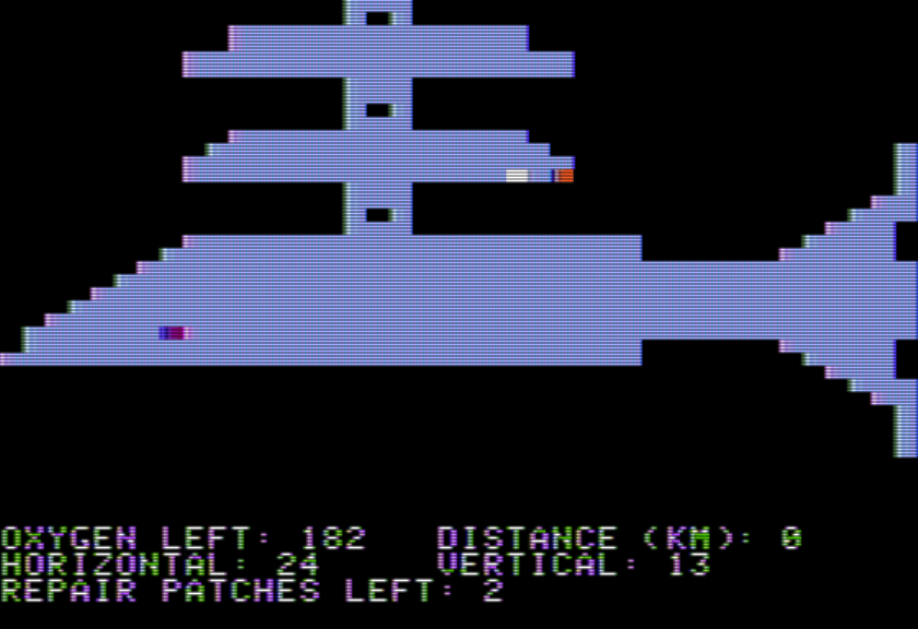 This means what is actually moving in the game is the numbers on the bottom, since for the most part the screen stays the same color as you’re spacewalking along the outside of the ship. It feels a little bit like playing the old Lunar Lander game in that way. On the computer model I was emulating the numbers moved rather fast (even at “realistic speed”) so it took a couple tries before I hit placing the patch at the right moment (as the spacesuit passes by the “purple” spot). Still, the main problem was deciphering what all this meant, so I guess it sort of counts as a puzzle, in a meta way, more than a twitch-fingers sequence.