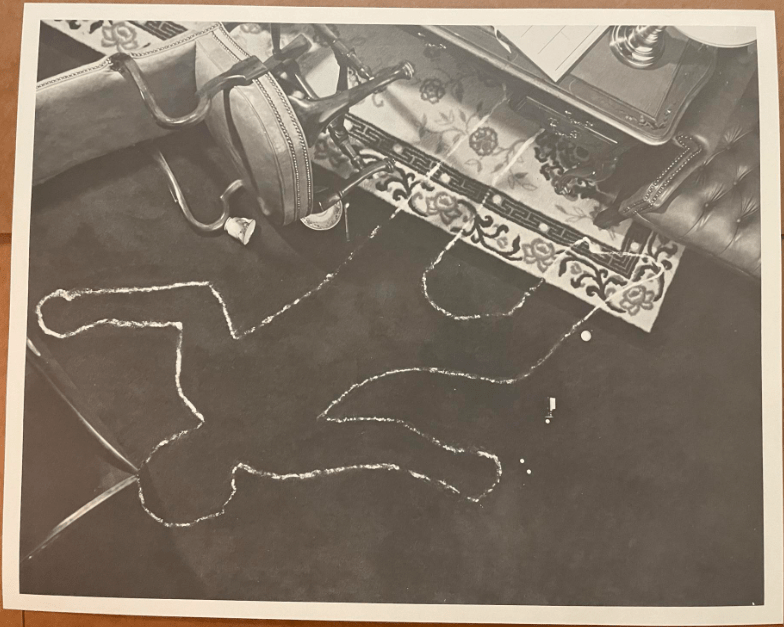 Issue #2: the coroner report mentioned the front left temple. Assuming he turned around and fell forward, hitting the furniture as shown (the chalk outline actually goes underneath, slightly) it seems reasonable he’d have some manner of temple injury, but unless I’m misunderstanding, wouldn’t the damage be to the right temple?