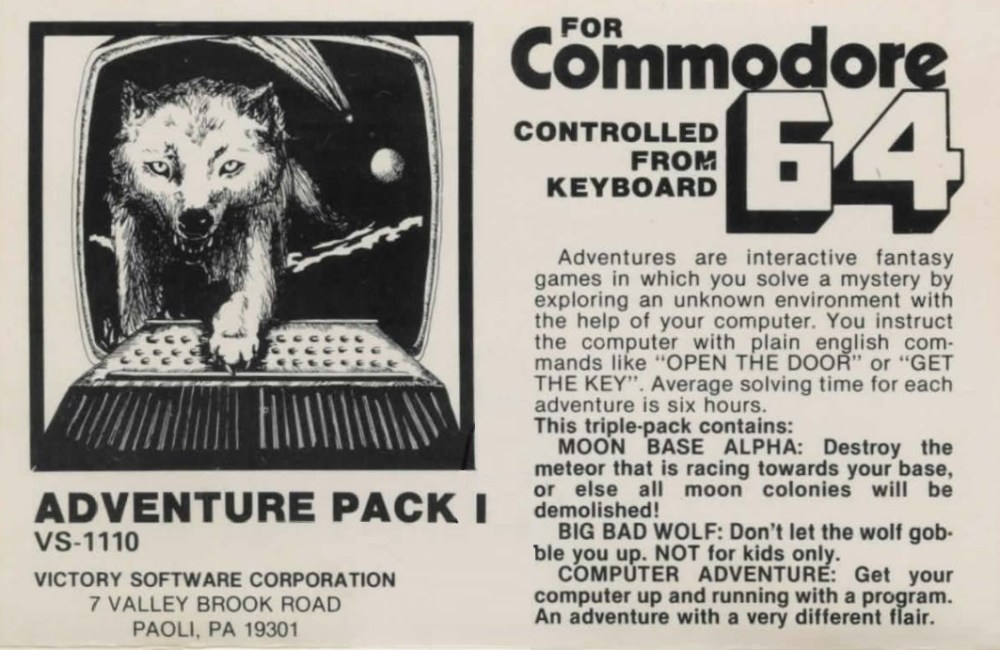 I mentioned last time an Adventure Pack consisting of Computer Adventure, Big Bad Wolf, and Moon Base Alpha. My working theory is that when Big Bad Wolf got published by Commodore in a collection, the author Bruce Robinson did a switch. This is entirely a guess, and on Bruce Robinson’s own page where he discusses the company (“At its peak, Victory Software employed 8 people at the main office”) he doesn’t talk about this at all, other than to say Commodore “licensed” both Big Bad Wolf and the action game Treasures of the Bat Cave, and neither show in later ads for Victory. (It is, to be admitted, one of those minute things that only a tiny group of people care about, although Gareth Pitchford did some investigation.)