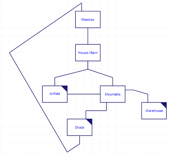 The above is what I have so far, a great deal of which is outdoors; I’ve only solved an absolute minimum of puzzles. Much of my time was spent wandering and checking exits. For example, there’s a “mountain” area which doesn’t look so terrible once laid out, but was sufficiently maze-y with “loops” that I had to drop objects in each room and test every possible direction.