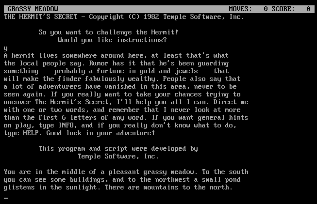 The Adventure port is of note because Gillogly originally did one extremely early using the C language (1977 while at Rand, later it went in the BSD Unix compilation) and it looks like the Gillogly/Billofsky version is simply a port of that. It’s also of note because The Hermit’s Secret has a strong foot in Original Adventure to the extent it might borrow some code elements (it keeps variants of dwarves and the pirate, for instance, although heavily reskinned). There clearly was also some influence from Infocom, as you can see from just the screen layout: