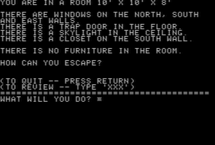 • Agreed, finding the endings would have been legit fun. It would make it so the “escape” wouldn’t even been the point, but maybe it was too early to make that leap in ludological development (btw, notice that the REM statements give 1980 as the development date, so this was written 1980 and only published 1982)