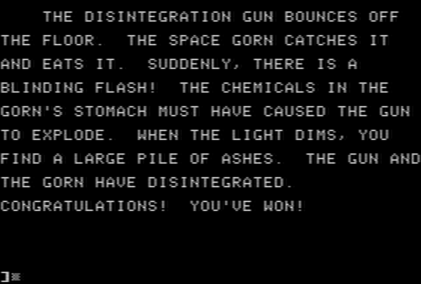 Just missing a few steps along the way: there’s a picture of William Shatner you need to tear down with a safe behind. You can OPEN PICTURE to find the safe combo inside (there’s a hint elsewhere to do this) and find a disintegrator gun. Fresh batteries for the gun are laying around in the open nearby. A quick hop back to the Gorn, and, victory?