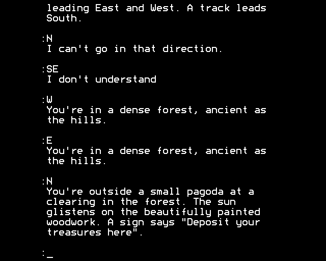 As is usual for authors still under the shadow of Crowther/Woods, the objective is to gather treasures. As is slightly unusual, the instructions state you need to DEPOSIT the treasures rather than DROP them to get points. The instructions don’t give how many treasures there are or even a maximum possible score.
