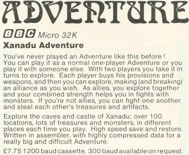 Paul Shave (see previously: Atom Adventure, Pirate Island) went for broke with his last adventure, moving from the Atom to the more capable BBC Micro. Back in 2014 he was contacted by Anthony Hope (one of our regular commenters); Paul helped Anthony beat Xanadu Adventure, and as Paul himself stated in this interview: