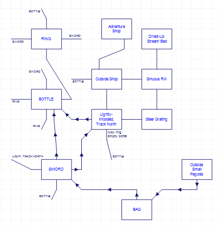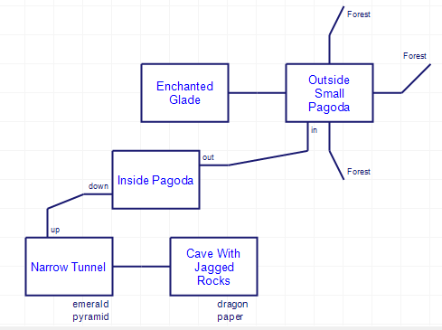 There’s a mostly unmappable forest (I tried, you can see my attempt above, but items started getting moved around and some exits shift at random); the only purpose of going in is to finding a pagoda.