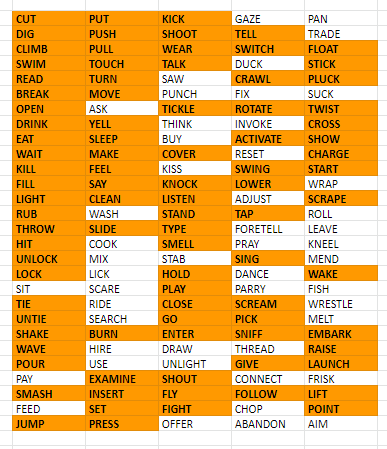 That’s a lot of orange. There are a few that might be just jokes and some that the game is counting as nouns instead of verbs (SWING: “What would you like to do with that?”) this is still one of the most lit-up lists we’ve had in the entire Project.