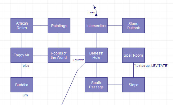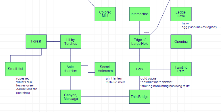 The “if you go down, you probably won’t be able to climb back up” is cribbed directly from Adventure; otherwise this is both a much tighter design in word count and a much weirder one. I (being fooled by the “look”) originally approached with the notion of Adventure Clone but that isn’t really the right attitude; remember this was originally a TRS-80 game, and has a room count limit so not nearly as much wasted space. Also, a vague sense of silliness: