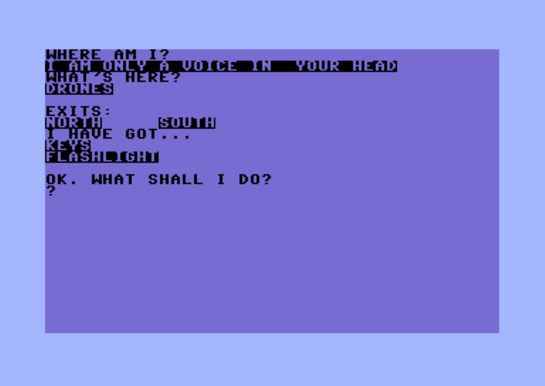 We’ve seen various angles for how to handle extra-small sizes (like the Bruce Robinson games): reduced verb lists, cut-down parsers, room descriptions that are just the name and any items nearby. This game includes all of them with a streak of complete and total surrealism. I’ve played some very bizarre games for the Project, but this genuinely might top them all.