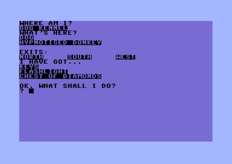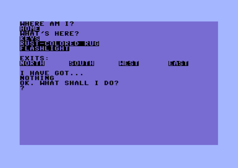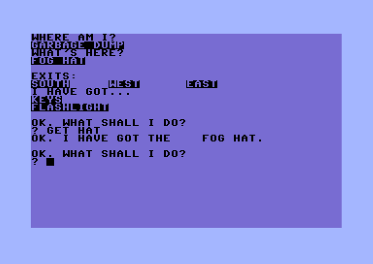 The opening room seems to be random; the item placement at first seems to be not. I say “at first” because one of the commands you can type is NEW GAME, and then things get weird indeed: