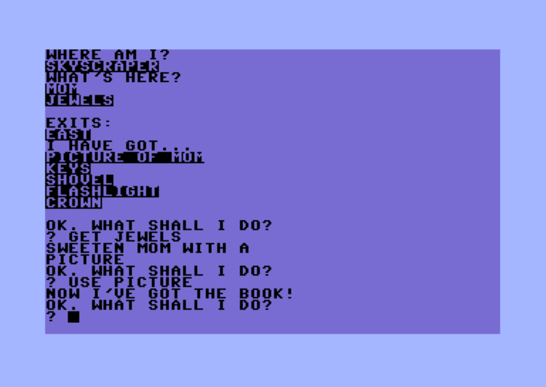 1. If you have the book you can also insta-travel with GO followed by a numerical value up to 50. The number is a location id#, you can find out about them in-game using the FIND [item name] command. This is somewhat broken/cheating, but not just as broken as you might think, because you can’t take your carried items with you, they are left at your former location. Still breaking the challenges of the game enough for me to consider it cheating.