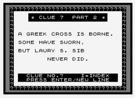 LAURY S. SIB is an anagram of SALISBURY. I don’t know how this links to the rest of Clue 7, but it’s a nice enough anagram that I feel like it has to be important.