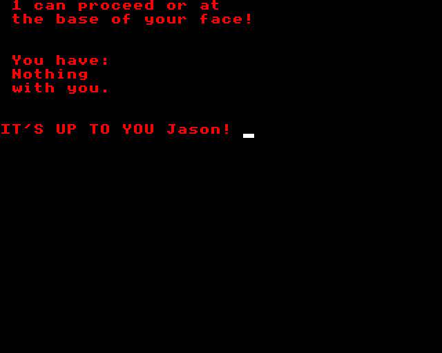 I’m … not so certain yet. For one thing, the parser and especially the world modeling system is relatively light; I don’t think the programming (by Penfold) has the sophisticated capability of interlocking complex daemons which require exact timing. (I’m avoiding spoilers, of course, but if nothing else I should point out the source is in BASIC.) I think, rather, this game is cryptic, and might have a couple absurd leaps of typing required. One kicks the game off, and it was a rather fortunate choice (as you’ll see in a moment) that I went with the BBC Micro port.