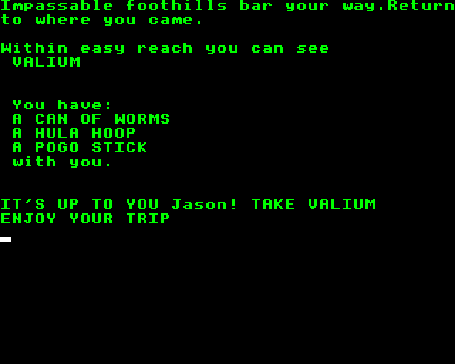 And from here I have gotten no farther. I suspect I need to re-check all the rooms post-Valium and the Pi-Man will have moved elsewhere. If not, then there’s some obscure item interaction in one of the rooms. Some of them do have a little description (a PRIVATE cul-de-sac has the game flash at you and warn you to get out, for instance) so the world isn’t entirely barren.