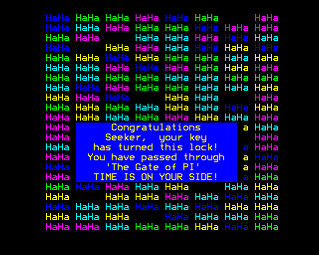 WELCOME SEEKER, YOU STAND BEFORE THE GATE OF PI. YOUR QUEST IS TO LOCATE THE GOLDEN SUNDIAL HIDDEN IN TIME AND SPACE BY THE CORRECT INTERPRETATION OF THE TRUTH THAT LIES WITHIN THIS PROGRAM.