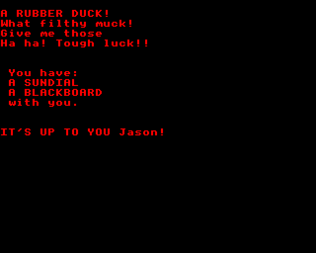 2. I’ve been mildly curious about this game ever since the first (and only!) time I heard about it in 1983, in an overview of adventures on the ZX Spectrum in a Swedish in a Swedish computer magazine. It didn’t go into much details, though. In fact, the description boiled down to (roughly translated) “Here, the freaked-out fantasy reigns supreme. You don’t know where you are, why you are there, or how to proceed. It took me quite a while to even get the game started. But after that, it’s a never-ending journey among rubber ducks and pork pies.”