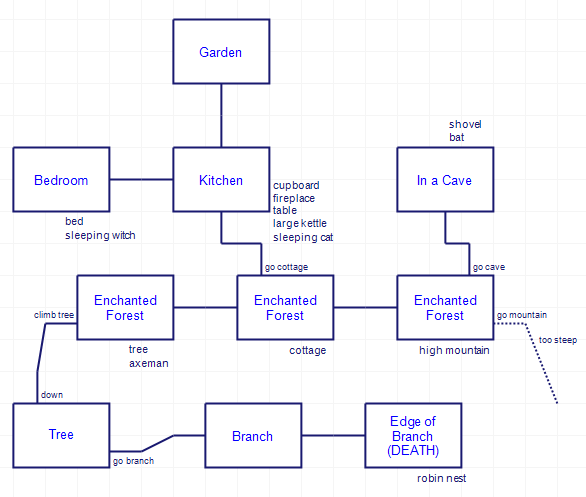 I mean, the first ingredient location is obvious, but taking a whisker without raising a fuss seems trickier. Can the blood and fingernails come from us? And I haven’t seen any snakes. What I have seen is a cave with a shovel and bat (not the flying kind), a garden with a MAGIC CHARM BRACELET (which you have to dig up), an AXEMAN by a tree (I can refer to the tree but not the axeman), a branch up the tree, and robin’s egg (see previous death screen).