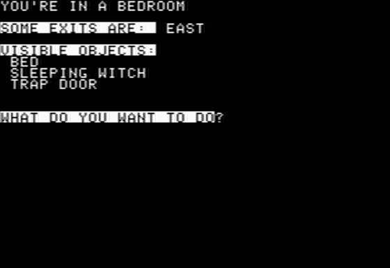 Since getting stuck last time I made a verb list (see above). One of the unused verbs was “MOVE” which I decided to try applying to a bunch of things; the thing it works on is the bed the witch is sleeping on (!). I guess that bracelet magic is strong stuff.