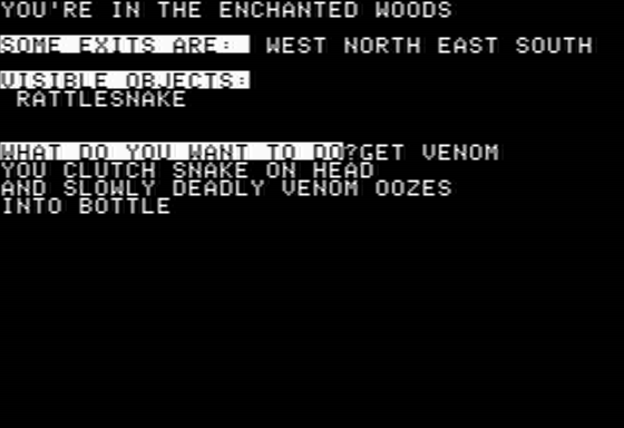 Snake venom, again: there’s a rattlesnake in the woods, but GET SNAKE doesn’t cut it, you need to specifically type GET VENOM.