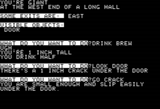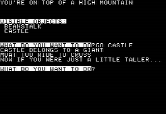 Moving the kettle to the fire and waving the wand, I was able to form a BREW and chug it. The game then says YOU’RE GIANT over every room description. I made a beeline for the castle: