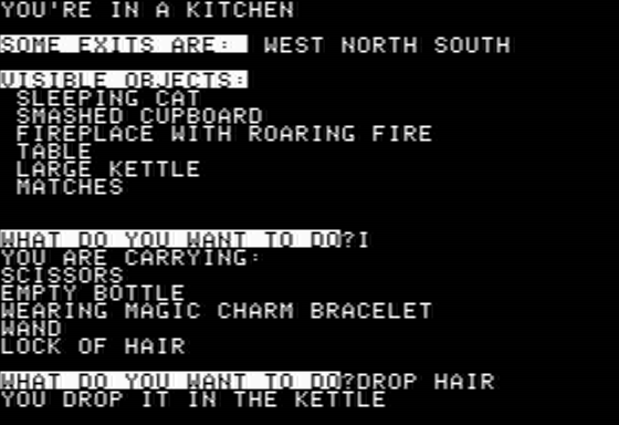 Zipping things ahead, I now needed: snake venom, human blood, nail clippings, cat whiskers. Scissors work on nails, easy enough. The bat I could get blood from, although I was having trouble because I was still trying to use the verb BAT; you need to refer straight for the thing you want out of it, BLOOD, by typing GET BLOOD while holding the bottle.