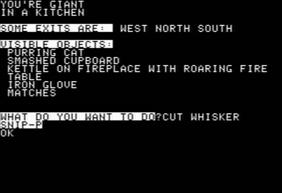 but having the AXE in inventory turns it into a SMASHED CUPBOARD, with a plethora of helpful items: a SUGAR CUBE, some CATNIP, and some SEEDS.