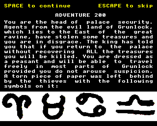 I’m playing on BBC Micro which has enough capacity to stuff the intro material without needing an extra instruction sheet. The premise is that all the treasures of your kingdom have been stolen and you are tasked with finding them while incognito. The only clue left behind is set of four symbols shown. I don’t know if this is meant to be Crowther/Woods style with gathering treasures from multiple rooms and this is just a creative way to kick things off, or if the treasures are realistically stored in a thieves’ hideout we need to infiltrate (like how Dragon Adventure only had treasure in the dragon’s lair). The “ALL the treasures” warning suggests the former to me.