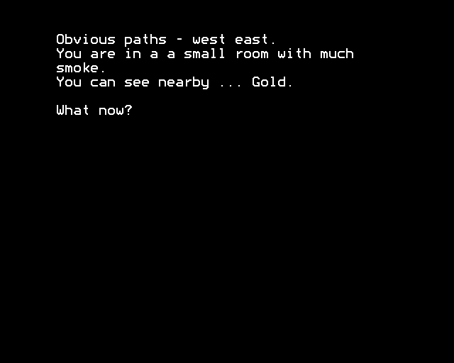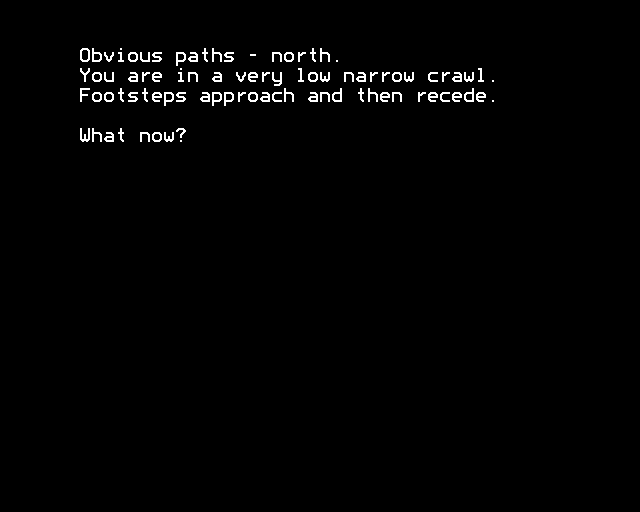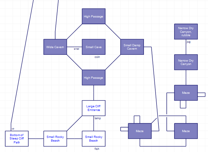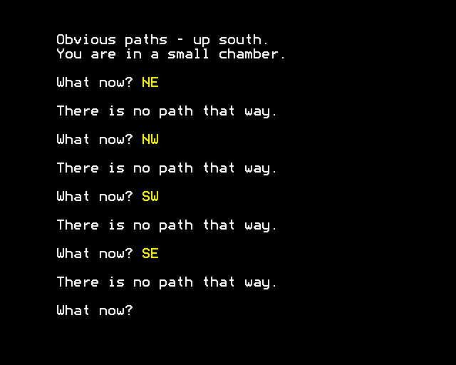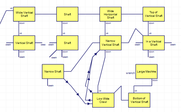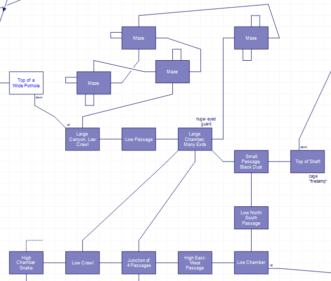 The upshot is, when making the map (first part above) I have to test every single exit in every single room. I’ve certainly had games like this before, but it is quite odd on a game that has a mechanism for listing exits. I’m not “working from scratch” at least, and in rooms which really do only have two exits, it makes things much faster since I can just plow through typing NW / N / NE etc. getting “There is no path that way” messages. Where path-searching is slow is when you find an exit, and then have to add it in, and go back to the original room and keep looking — but which exits did you already test? are you sure? better check all of them over again.
