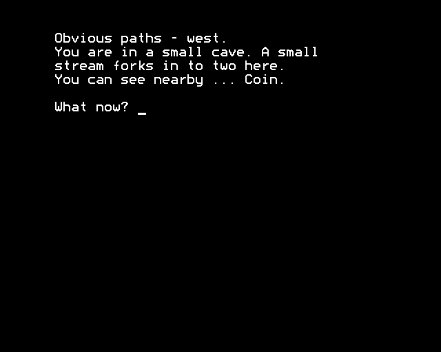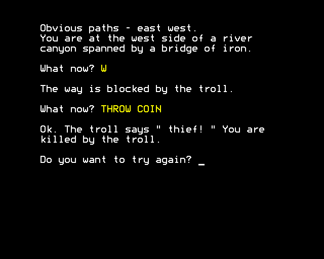 (The upshot is I don’t think I’ve softlocked the game by tossing the coin earlier in the game to the troll, but there needs to be some trickery in order to get back over the river. Still, maybe there’s a sneaky way to get from the west to the east side in a one-way fashion, and the coin gets used on the way back? Since we found the coin on the west side, not in the evil kingdom, I don’t think it counts as one of the stolen treasures.)