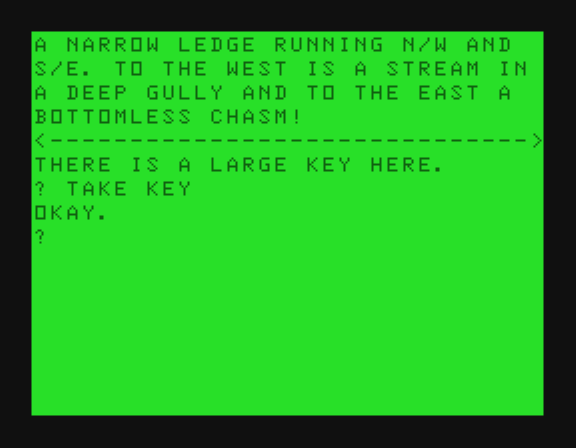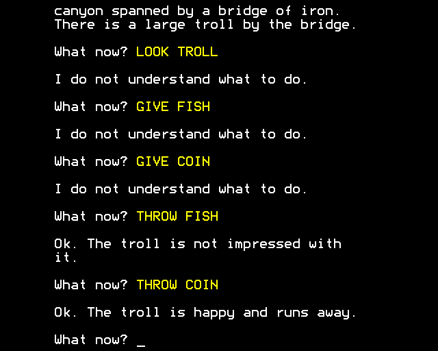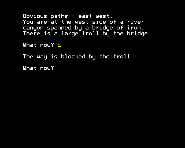 The mace/troll puzzle at the end particularly hit this hard. The behavior of the troll changing was non-obvious enough I was concerned I had hit a genuine bug. On the other hand, it is a.) logical the troll would change behavior if they see you with the massive treasure and b.) logical they would just spring up on you unawares. Working this out the “normal” way requires a lateral leap that isn’t really achievable any other way. Yet, I would personally never include the puzzle as-is in a modern game design. (It also isn’t 100% clear from the geography that the canyon edge you throw the mace at is the same canyon on the other side, it would have been a better puzzle had the geography been rigorous enough — that is, where distances are clear and exact — to allow seeing this naturally.)