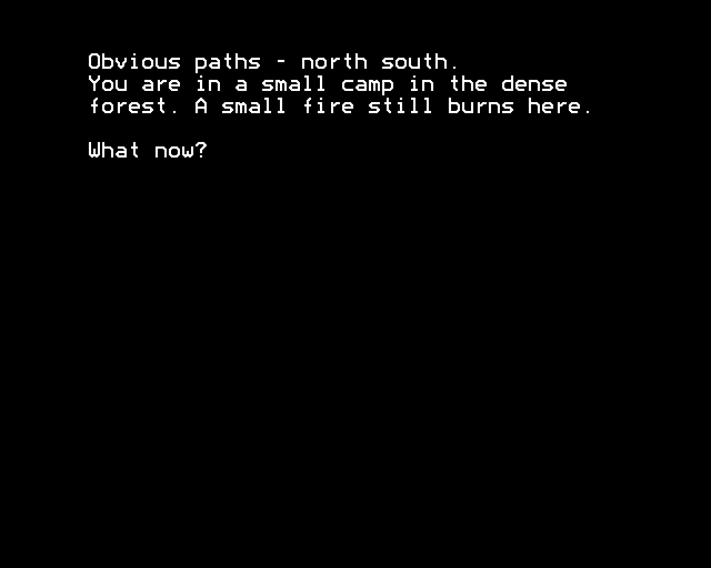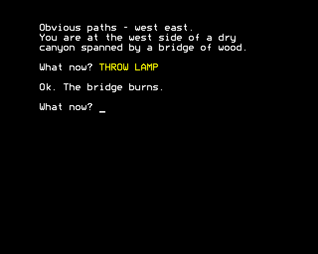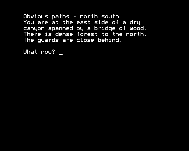 That is, consider the moment where the guards are chasing at the wooden bridge. There’s technically no timer running. When you try to move on, the game checks if you’ve burned the bridge, and if not, it kills you. This almost plays a little bit like “drama time” (a game like Colonel’s Bequest where some events wait for you to be physically present before they happen) because the verb list is so short there isn’t strong motivation to hang around in a particular location, so it feels natural to have time move forward along with movement.