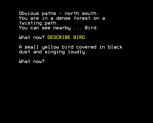 Most of this area is “dense forest”, although there’s a canyon crossed by a wooden bridge that seems ominous (it isn’t an obstacle, but I could easily see something causing it to burn/collapse if our adventures go awry). There’s also a classic Adventure bird: