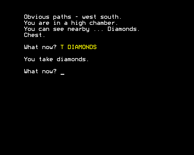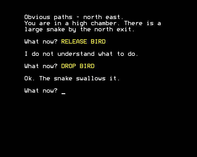 One other game design wrinkle is the use of a technique which is not recommended at all for a modern game, but nonetheless gets a unique effect. (See: the text version of Cranston Manor compared with the graphical one, where the maze-like town opening led to a much greater sense of place, but it was still an awful maze.) Here, there’s some “hidden effects” where the game is willing to silently check if you have a particular item. For example, the guard at the diamonds wakes up if you have the bird. The game doesn’t even tell you why the guard woke up, so it leads to a strong paranoia where you are thinking not only about what items you should be carrying but what items you should not be carrying. This adds a second combinatorial level of puzzle complexity, but — well, it really is also genuinely unfair.