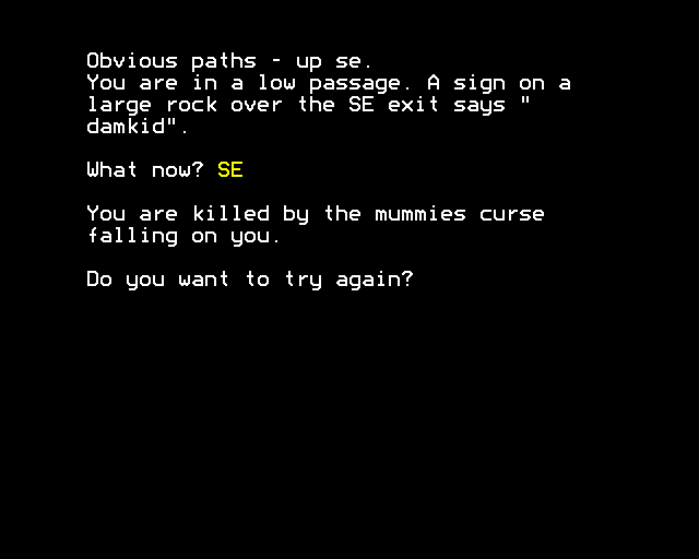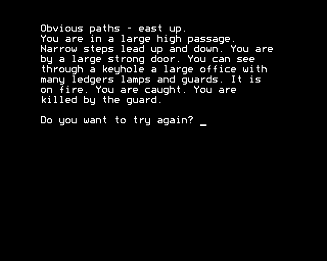At the very least, this one is allegedly long and complicated; Exemptus from CASA calls it “surprisingly vast and difficult” and there’s even a letter from a 1984 issue of Micro Adventurer which states roughly the same, as “Irene Feeney, of Basildon in Essex” gives an open offer for help for anyone sending a self-addressed envelope.
