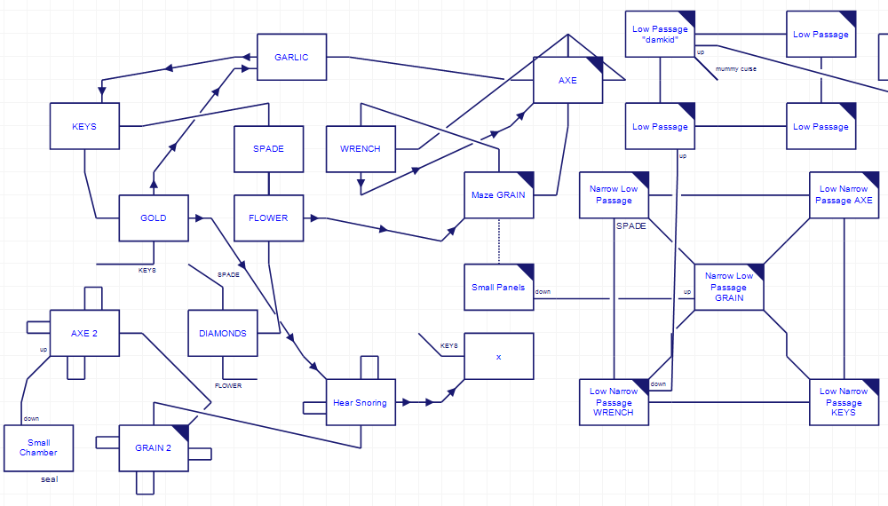 To be clear, this is meant to show the interconnectivity of the various regions, and isn’t exact about directions. Once getting by the coal maze you get into a “mace maze”, a small outdoors section, a castle, and a pyramid. (Well, theoretically a pyramid. I haven’t solved that part yet, but I have dealt with the others.)
