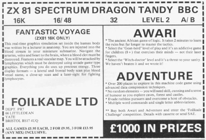 But to back up: this involves yet another one of those flash-in-the-pan UK companies founded around 1982, in this case a company named Foilkade Ltd., which seems to be by all evidence run solely by one person, C.J. Coombs. Starting in the December 1982 issue of Sinclair User, they advertised three games, Fantastic Voyage, Awari and Adventure 200, with a tack-on to the contest craze: an award for the first person who gives a correct solution to both Awari and Adventure.
