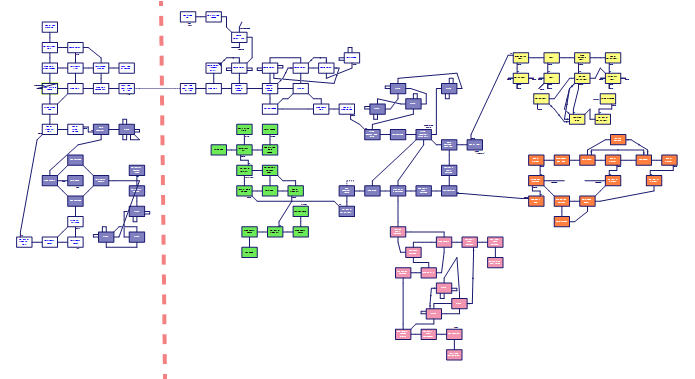 My map so far. Based on room count I’ve only seen half of them. The boundary between the kingdoms is marked with a red dotted line.
