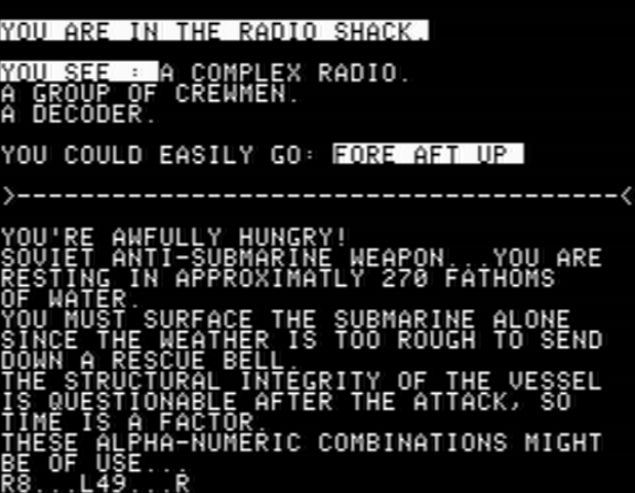The middle part of the ship has controls: a “missile compartment”, a periscope room, a “main control room”, a “radio shack”, and an “access hatch” that requires the ship to be surfaced to be able to open. The radio shack has a broken radio, although it takes some effort to fix. The control room is the important part for the very start of the game: