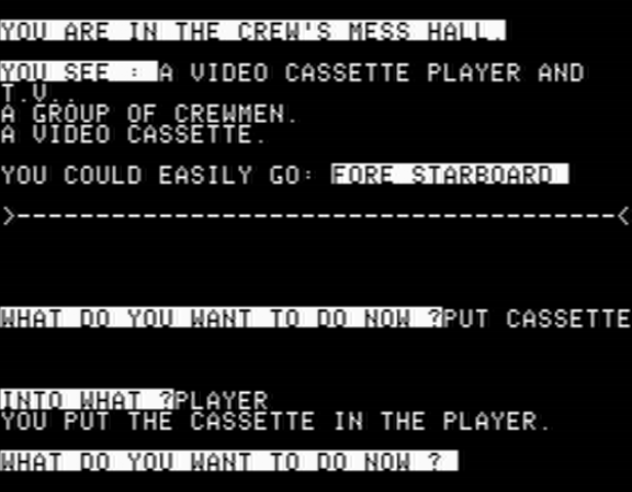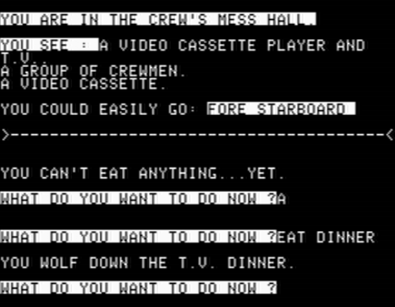 The room with the video player also is related to another difficulty: the hunger. There’s a “stores room” with a “frozen tv dinner” that you can cook in a stove; I got that far. But the game kept saying I couldn’t EAT it. That’s because eating it only works in the mess hall, even if you’re starving.