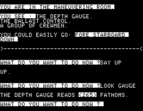 All attempts at saying “UP” or “SURFACE” failed. I could try “FIRE” and the game asked me what I wanted to fire (there’s missiles and torpedoes) but it told me I couldn’t use them yet.
