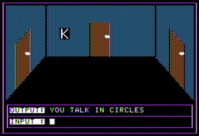 For the last one you get booted back to the Castle at the start, and yes, those are meant to be adventure game references, the last being The Wizard and the Princess from On-Line Systems. There’s also a Mystery House reference (where you get a MURDER flag set on your character if you get in there). The real route to go is FORWARD repeatedly, which is no doubt an intentional tweak by the author. (The most naïve thing a player will do upon finding their first maze is just going the same direction repeatedly, and authors put forward effort to make sure that would never work.)