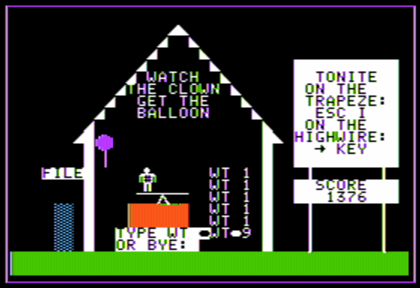 After this I got a mission repeat (shrinks again). Looking over the design doc, there’s only one other mission, to set the file cabinet at the Carnival on fire. You can do that by buying MATCHES, then going to the bit where you can add weights, and typing the commands ESC and I. This moves the cursor one step up (this is just Apple II shenanigans). Then you can tap right-arrow until you get launched out of the carnival. If you have the mission you’ll then set the file cabinet on fire.